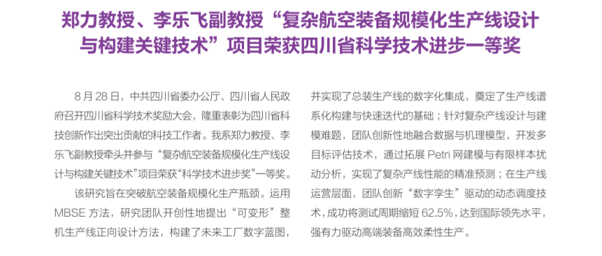 工业工程系郑力教授、李乐飞副教授“复杂航空装备规模化生产线设计与构建关键技术”项目荣获四川省科学技术进步一等奖