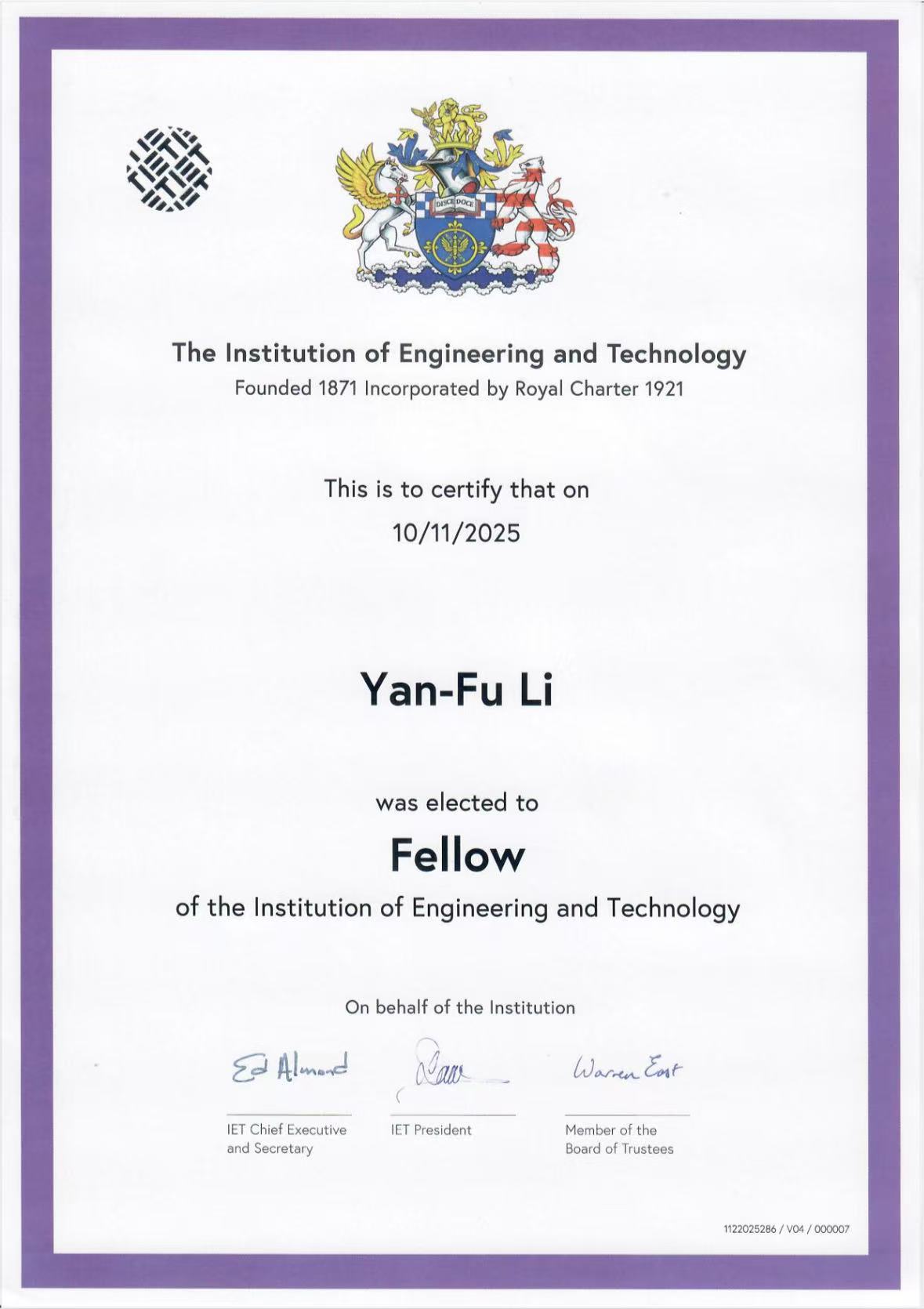 工业工程系李彦夫教授当选英国工程技术学会会士(IET Fellow)