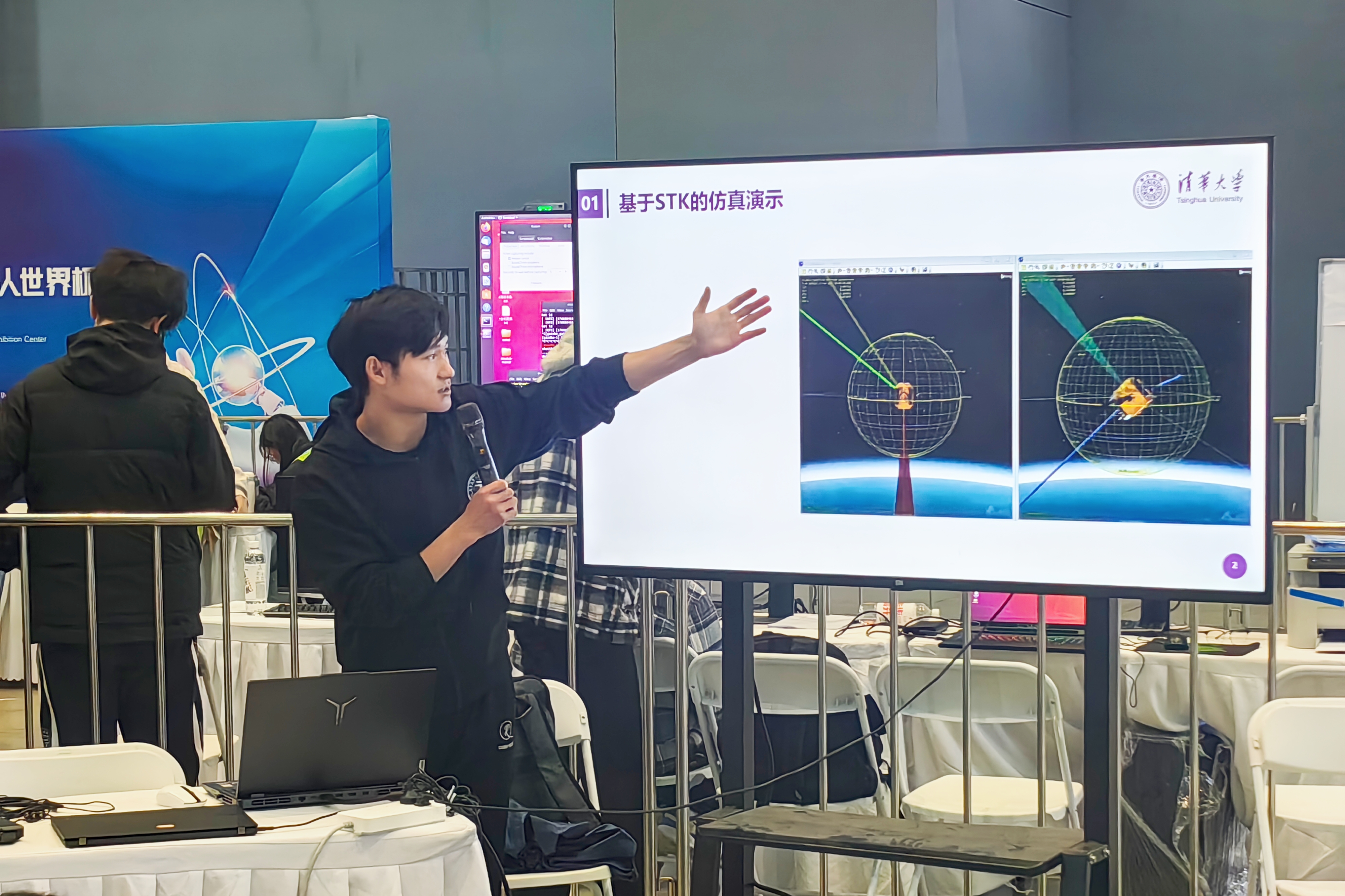 在积分赛环节,各队阐述了卫星轨道仿真模拟与姿态控制算法的设计思路,并通过仿真界面直观展示了卫星运动和跟踪效果。答辩中,同学们介绍了算法原理和实现过程,以严谨的逻辑和完整的系统呈现,赢得了来自航天系统的四位总师评委的高度评价,展现了清华学子勤奋、求实、创新的学风。