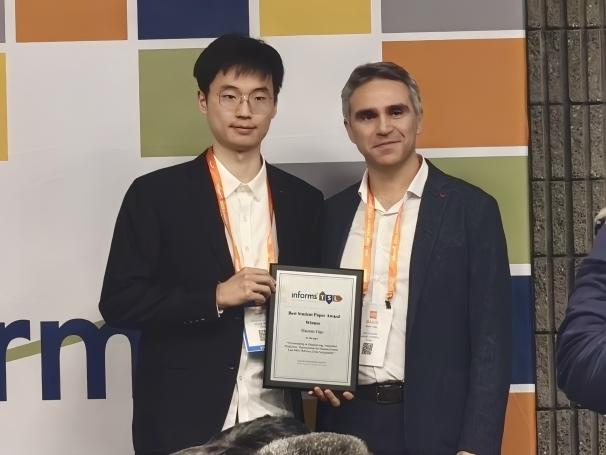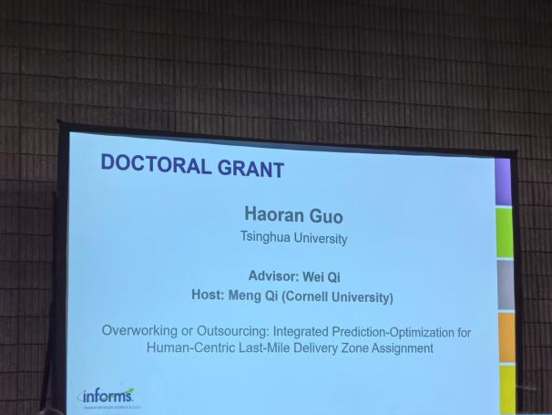 郭浩然同学以第一作者身份完成的论文Overworking or Outsourcing: Integrated Prediction-Optimization for Human-Centric Last-Mile Delivery Zone Assignment(《过劳还是外包:以人为本的最后一公里配送区域分配集成预测-优化模型》),在全球43份申请中位列第一,获得运输科学与物流(Transportation Science and Logistics, TSL)分会最佳学生论文奖。获奖论文聚焦最后一公里配送等场景中工作量波动下的加班控制问题,核心围绕“过劳”与“外包成本”的权衡,旨在解决传统先预测后优化方法中预测模型与决策目标错位导致的次优决策及员工福祉受损问题。研究将该问题构建为上下文随机优化问题,提出集成预测-优化框架,通过建立决策感知点预测模型,理论证明其具有有界超额决策风险,并开发高效实用算法。数值实验表明,该方法显著优于传统两步法,简单决策聚焦预测在决策质量上可超越复杂神经网络。基于真实配送数据集的案例研究显示,其相比传统方案减少17.29%加班时长,且不增加总决策成本。